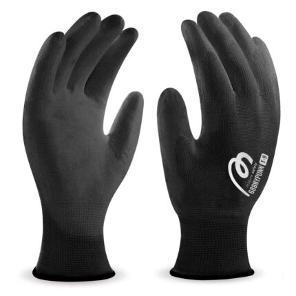 Guante de poliéster negro con recubrimiento de poliuretano negro.