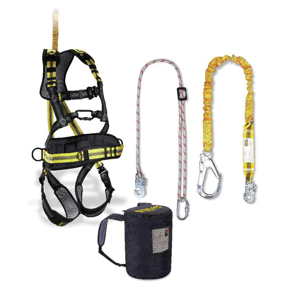 Arnés STEELTEC PRO con enganche dorsal y esternal con cinturón de posicionamiento y prolongador (1888ACPLUSSIN), cuerda regulable con mosquetones (1888CURMSIN), cinta Elástica STEEL FLEX con absorbedor y mosquetones (1888AEGSIN) y mochila tejido Oxford (1888BAGSIN).