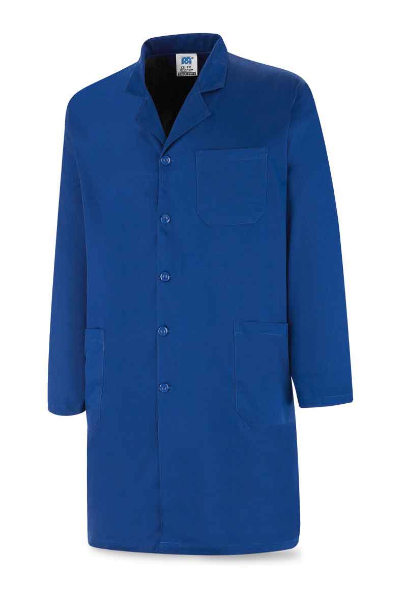 Bata Unisex con cuello de solapa, fabricada con tejido de 200 gr/m2. 1 bolsillo de plastrón en pecho y 2 a cadera.