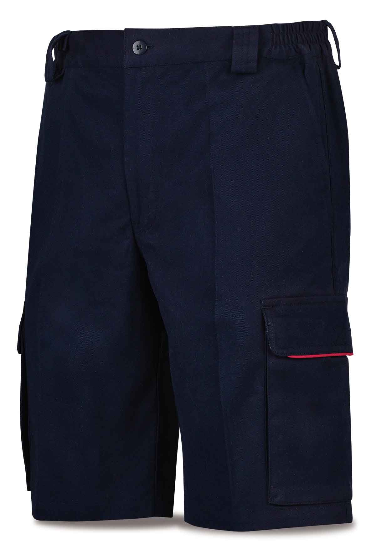Bermuda fabricada con tejido de 240 gr/m2. Seis bolsillos, dos en pernera tipo cargo con fuelle y cierre con tapeta con vivo rojo, dos en caderas tipo francés y dos traseros. Composición: 98% algodón y 2% elastano.Masa laminar: 240 gr/m2