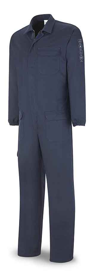 Buzo ignífugo y antiestático con protección contra calor y llama, soldeo y procesos afines y los efectos térmicos del arco eléctrico. Tejido de algodón tratado con resistencia de las propiedades del tejido para 50 lavados, muy ligera y confortable. Pictogramas y normas certificadas, grabados por transferencia de calor en color plata y retrorreflectante, en un lugar altamente visible de cara a facilitar las labores de cumplimiento de la prevención de riesgos laborales en las industrias metalúrgica, petroquímica y naval.