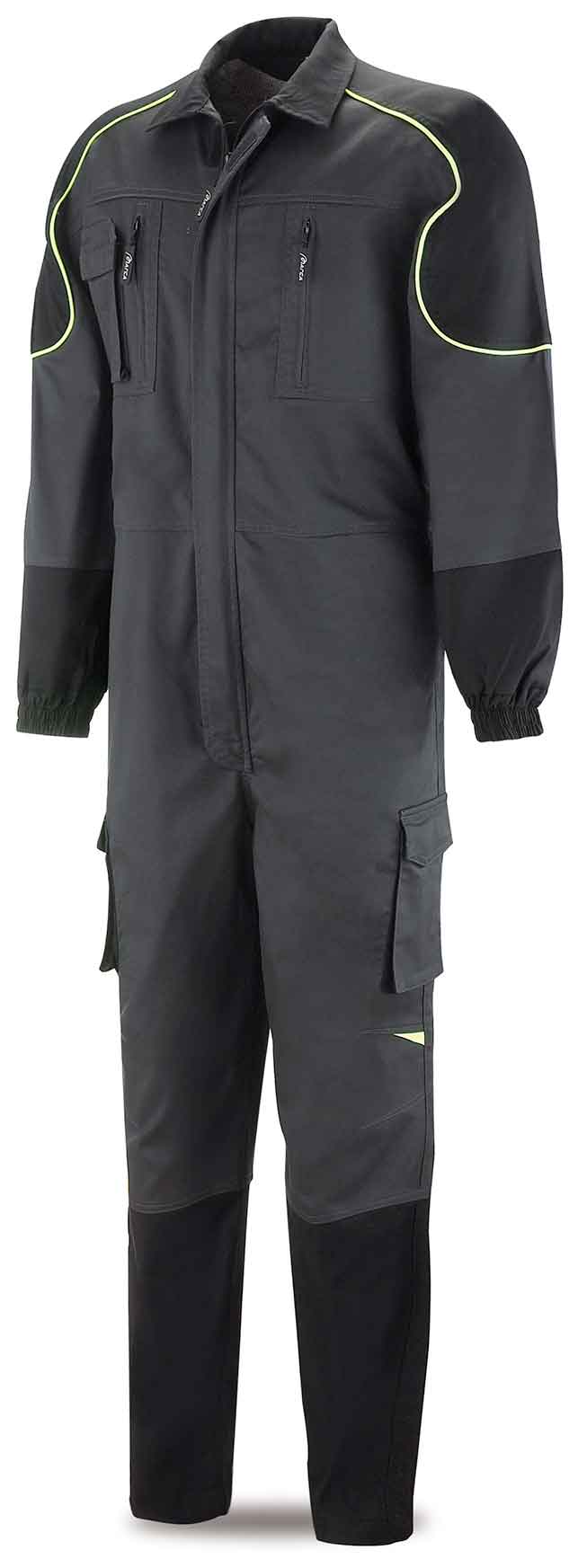 Buzo con mangas ranglan mixtas, cuello camisero, tapeta exterior completa en cremallera principal, 8 bolsillos, pieza canesú en delantero, cintura ajustable mediante elástico trasero. Ribete vivo tipo bies de contraste amarillo fluorescente en borde de piezas de contraste de color negro en hombros que conforman el ranglan.Composición y masa laminar:Composición: 58% poliéster, 39% algodón y 3% elastano.Masa laminar: 245 gr/m2.