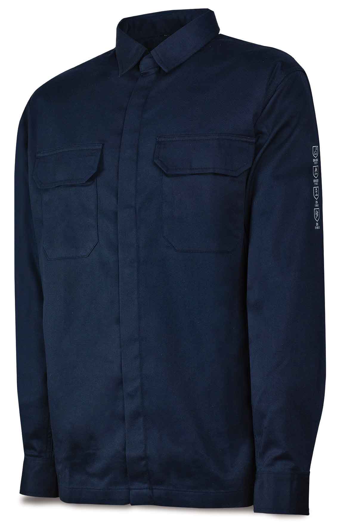 Camisa ignífuga y antiestática con protección contra calor y llama, soldeo y procesos afines y los efectos térmicos del arco eléctrico. Cuello camisero. Costuras de meta aramida. 2 bolsillos en pecho con tapeta y cierre por un punto de velcro.
