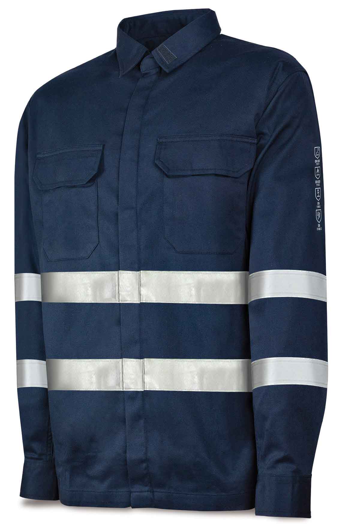 Camisa ignífuga y antiestática con cintas reflectantes con protección contra calor y llama, soldeo y procesos afines y los efectos térmicos del arco eléctrico. Tejido de algodón tratado con resistencia de las propiedades ignífugas del tejido para 50 lavados. Pictogramas y normas certificadas, grabados por transferencia de calor en color plata y retrorreflectante, en un lugar altamente visible de cara a facilitar las labores de cumplimiento de la prevención de riesgos laborales en las industrias metalúrgica, petroquímica y naval.Composición:98% algodón (tratado) 2% poliamida.Costuras con hilo de meta-aramida