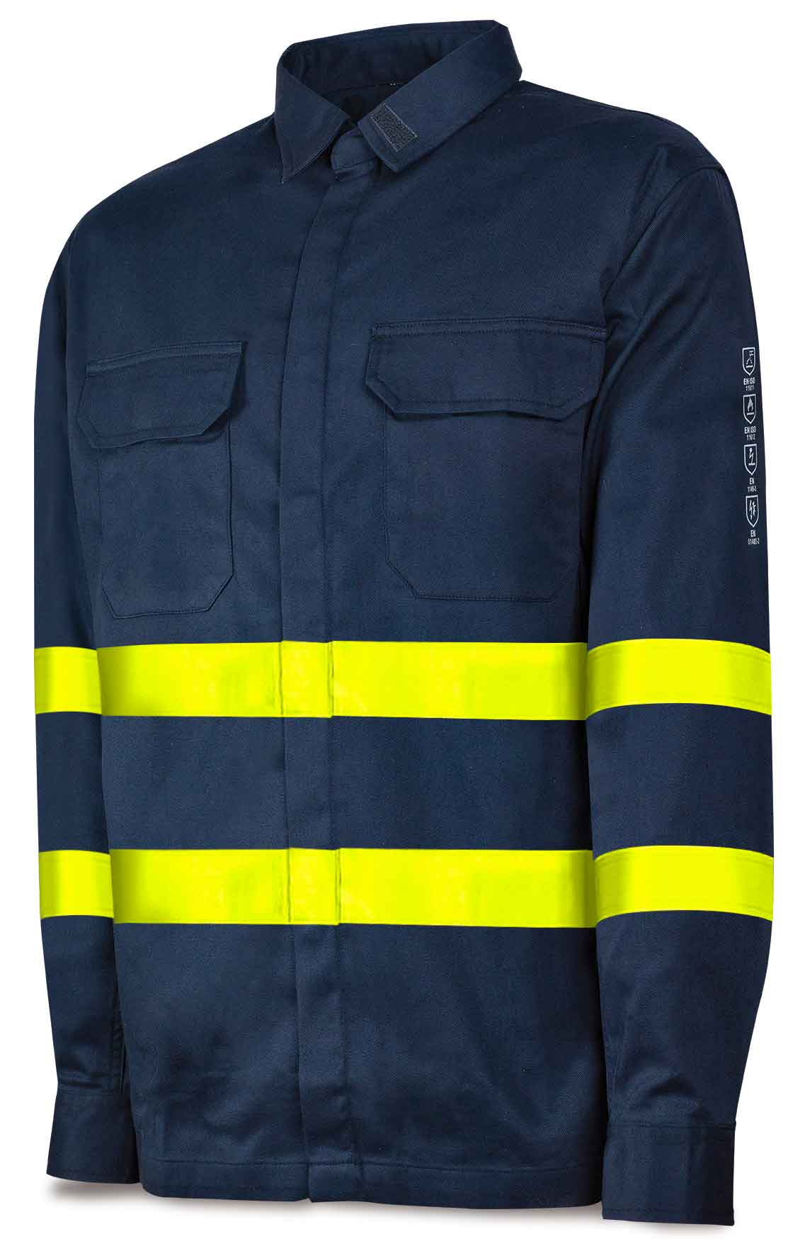 Camisa ignífuga y antiestática con cintas reflectantes de material combinado con protección contra calor y llama, soldeo y procesos afines y los efectos térmicos del arco eléctrico. Ajuste elástico en puños. Cierre frontal por snaps metálicos y tapeta. Cintas reflectantes de material combinado de 50 mm.