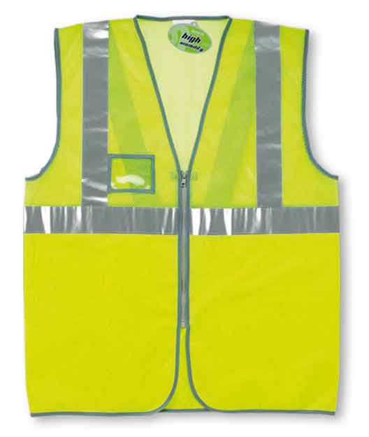 Chaleco alta visibilidad con cierre frontal de cremallera vertical, visible, de poliéster de dientes de 6mm, desde bajo prenda con tope a medio pecho y porta etiquetas transparente con mismo ribete que la prenda.