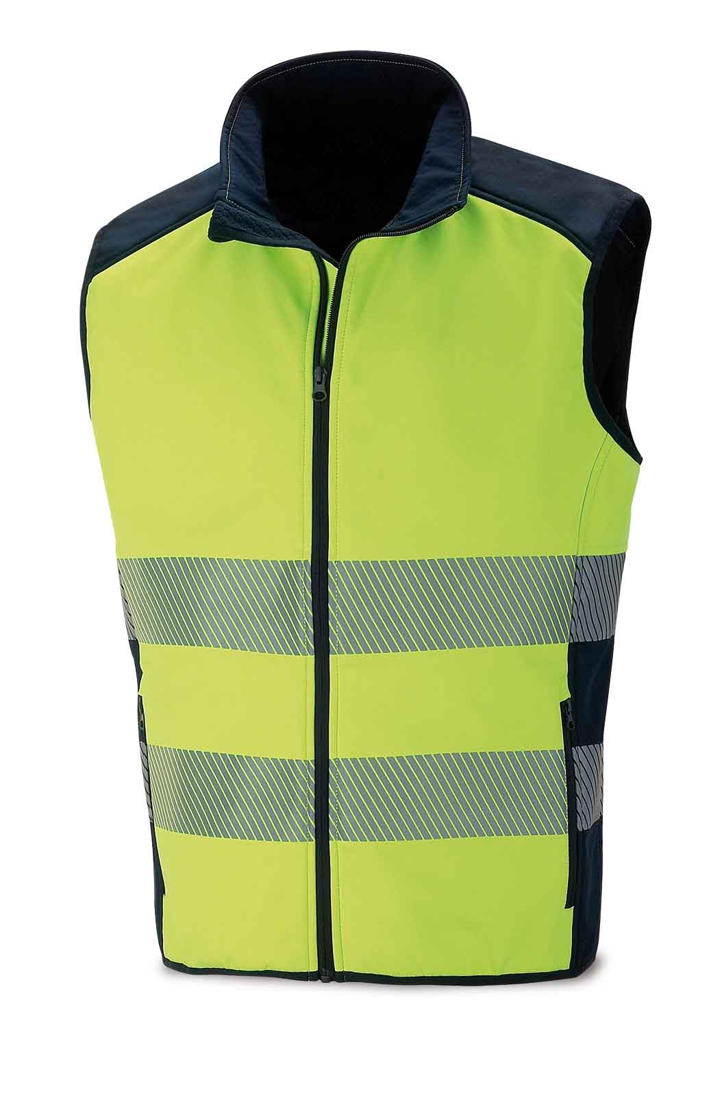 Chaleco Alta Visibilidad SoftShell triple lámina en color amarillo/azul marino con dos bandas retrorreflectantes de 7 cm de ancho segmentadas y termoselladas. Lámina interior de tejido polar con grabado. Sisas y bajo prenda rematado con ribete elástico en color de contraste, que define los bordes de la prenda y dos bolsillos laterales de boca vertical en ambos lados de la parte delantera.