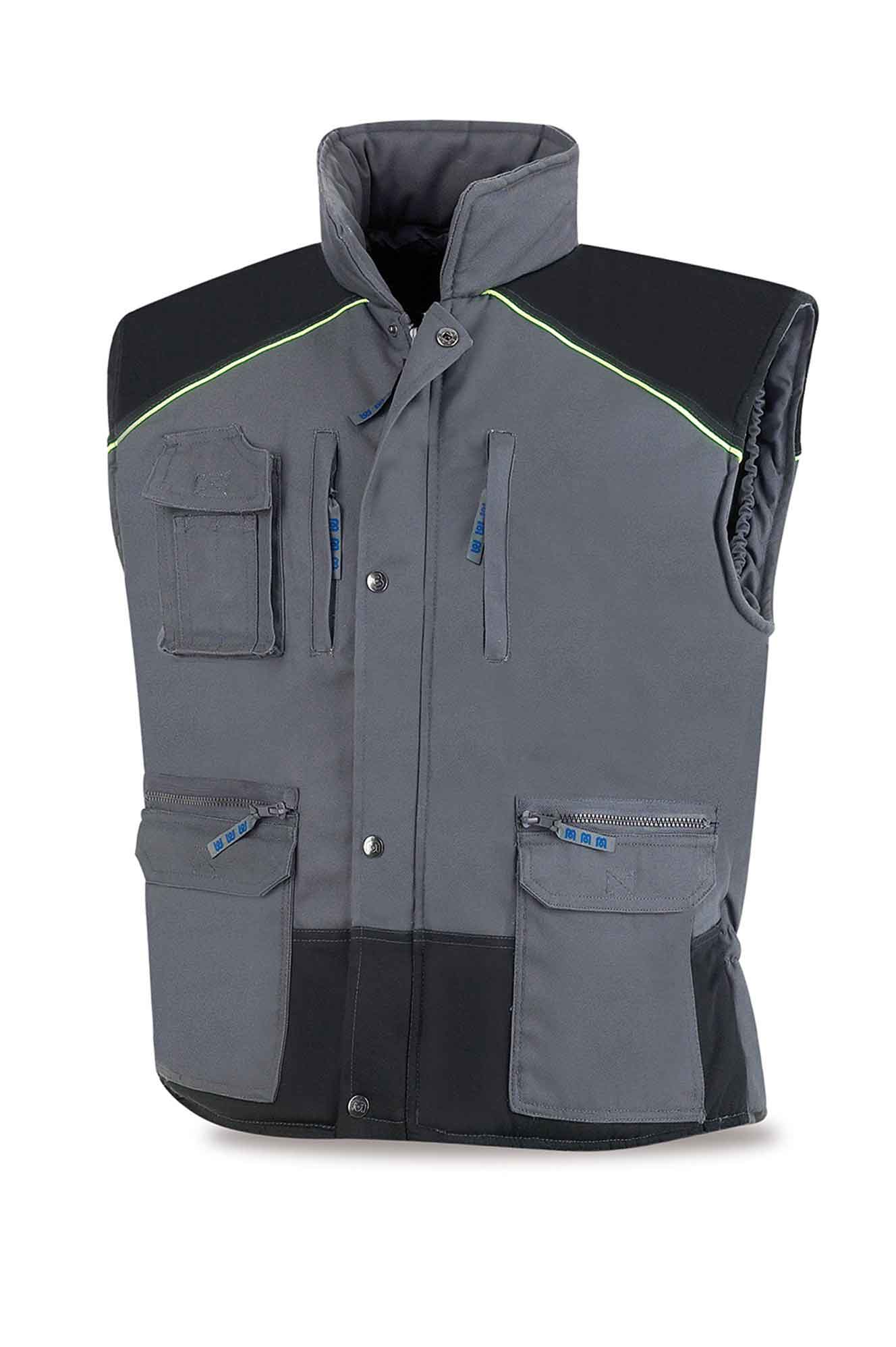 Chaleco de color gris con contrastes en negro en zona inferior del panel frontal y hombros, con ribetes amarillo fluorescente en el corte del canesú delante y detrás, muy resistente y práctico. Diseño rectilíneo para favorecer movimientos del tronco inferior. Muy buena relación: térmica vs. peso. Ideal para trabajos que requieran estibar diferente tipología de herramientas y dispositivos, debido a su amplia gama de bolsillería. Faldón cubre riñones.
