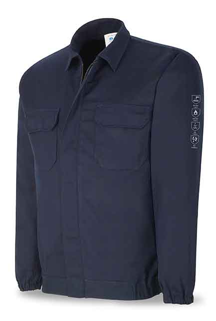 Chaqueta ignífuga y antiestática con protección contra calor y llama, soldeo y procesos afines y los efectos térmicos del arco eléctrico. Cuello camisero. Ajuste elástico en cintura. Ajuste elástico en puños.COMPOSICIÓN:98% algodón (tratado).2% poliamida.Costuras con hilo de meta-aramida.