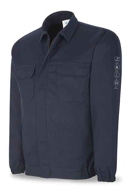 Chaqueta ignífuga y antiestática con protección contra calor y llama, soldeo y procesos afines y los efectos térmicos del arco eléctrico. Tejido de algodón tratado con resistencia de las propiedades del tejido para 50 lavados, muy ligera y confortable. Pictogramas y normas certificadas, grabados por transferencia de calor en color plata y retrorreflectante, en un lugar altamente visible de cara a facilitar las labores de cumplimiento de la prevención de riesgos laborales en las industrias metalúrgica, petroquímica y naval.