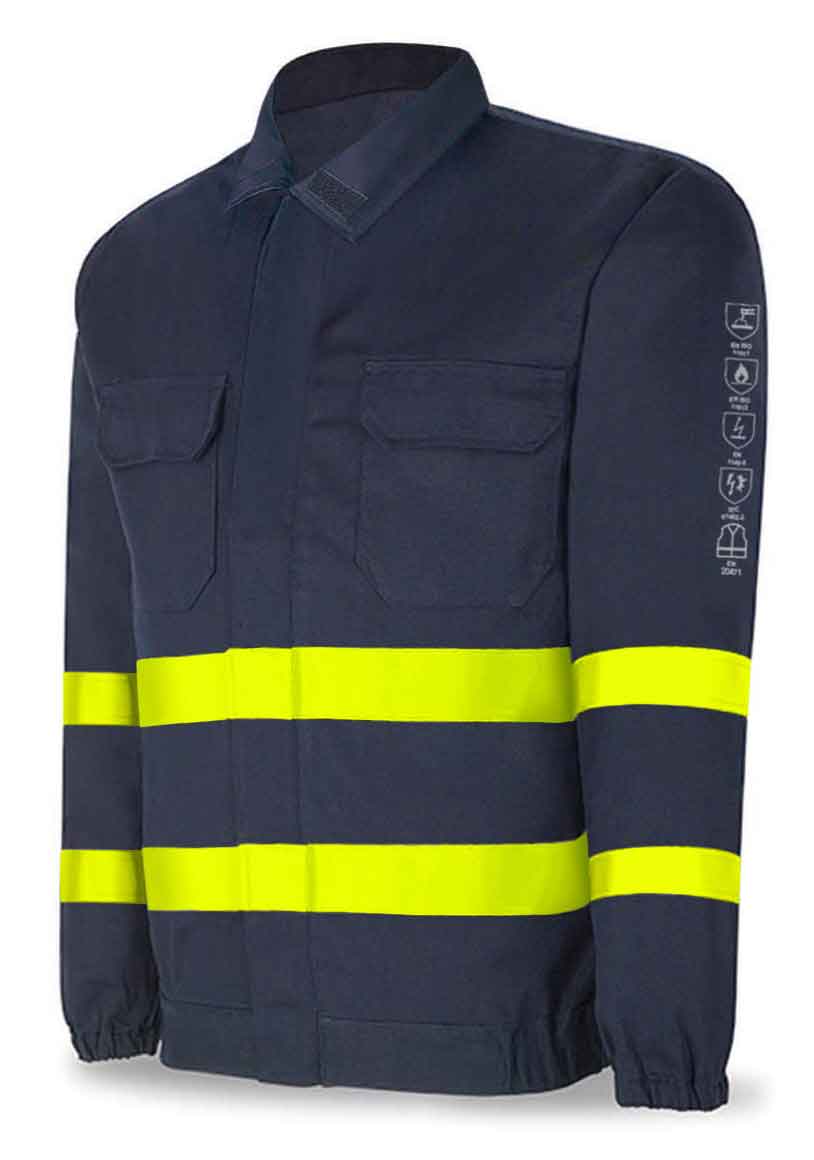 Chaqueta IGNÍFUGA y ANTIESTÁTICA multinorma con cintas reflectantes. Algodón 260 gr.