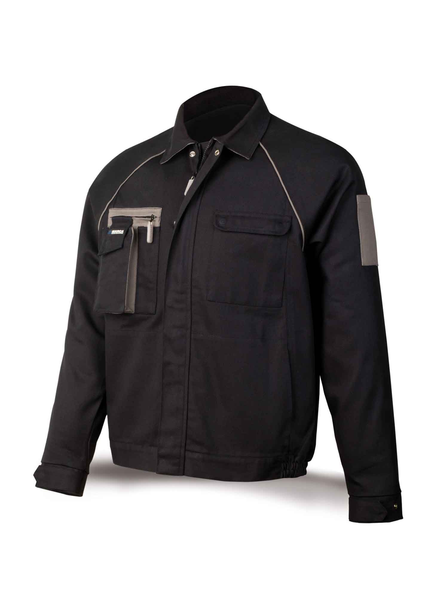 Chaqueta con colores de contraste fabricada con tejido 100% algodón de 270 gr/m2. 5 bolsillos. Mangas ranglán limitadas por ribete del color de contraste. Doble tapeta. Color negro con contrastes en gris.
