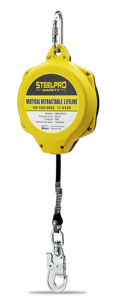 Mosquetón de acero y mosquetón anti-vueltas (evita la torsión y rotura de la cinta), con indicador de caída.