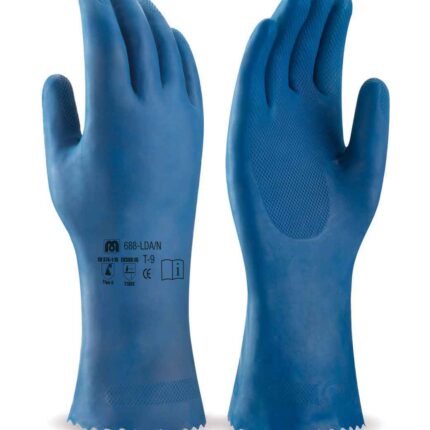 Guante tipo doméstico de látex azul para riesgos químicos y microorganismos.