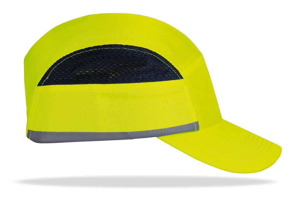 Mod. “BUMPER PRO”. Gorra de protección anti golpes con rejillas de ventilación lateral. Color Amarillo Alta Visibilidad con bandas reflectantes. BUMPER PRO