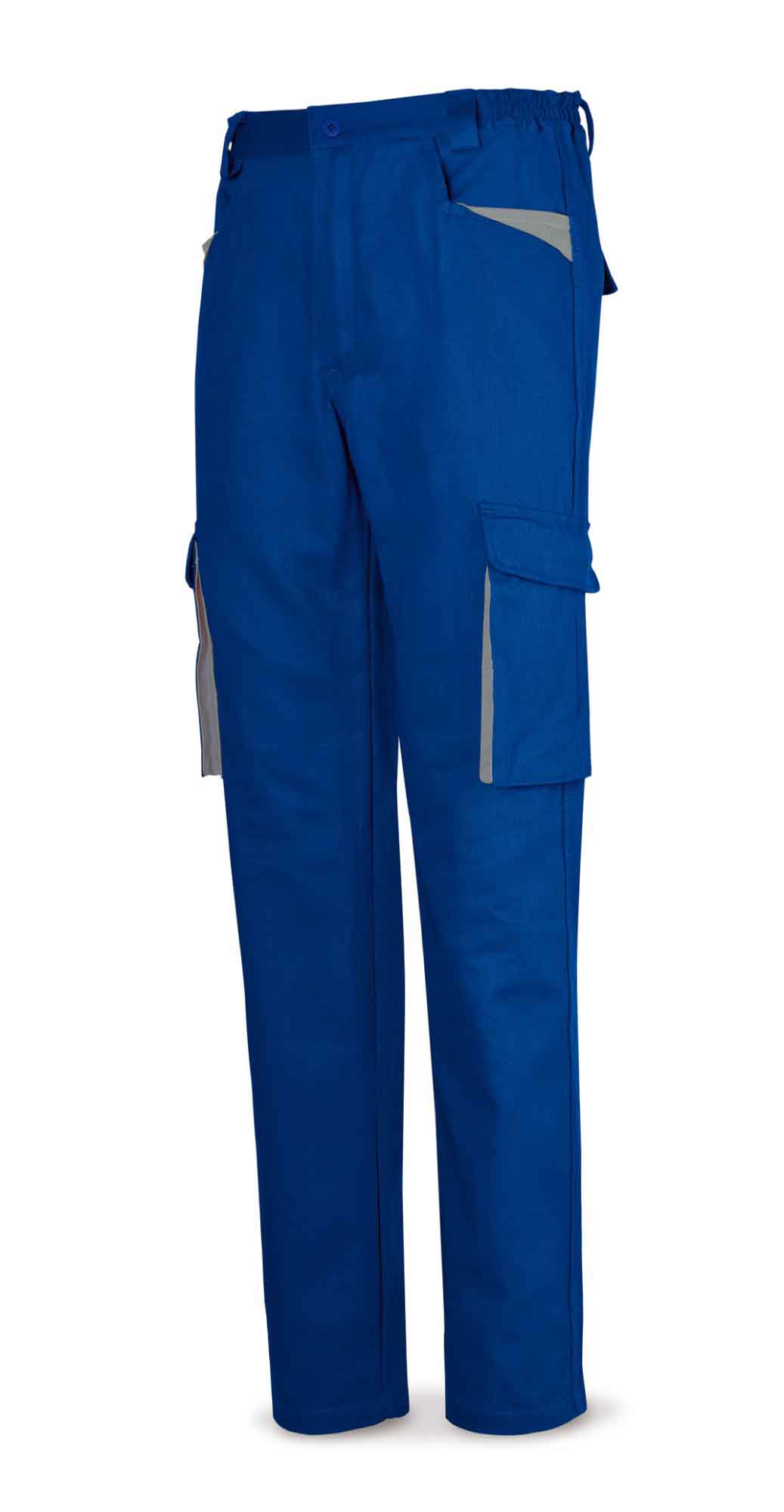 Pantalón fabricado con tejido de 270 gr/m2. Seis bolsillos: dos en cadera tipo western, dos en pernera tipo cargo de fuelle y dos traseros. Cinturilla extra alta en espalda. Trabillas extra anchas en cintura. Color azulina con contraste en gris.
