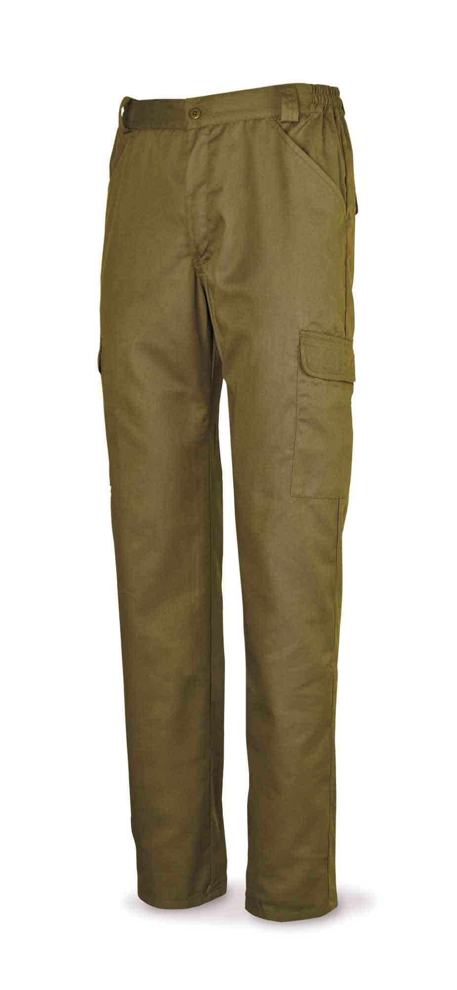 Pantalón fabricado con tejido de 200 gr/m2. Seis bolsillos: dos en pernera tipo cargo de plastrón, dos en cadera tipo diagonal y dos traseros de plastrón con cierre por tapeta. Trabillas extra anchas en cintura.