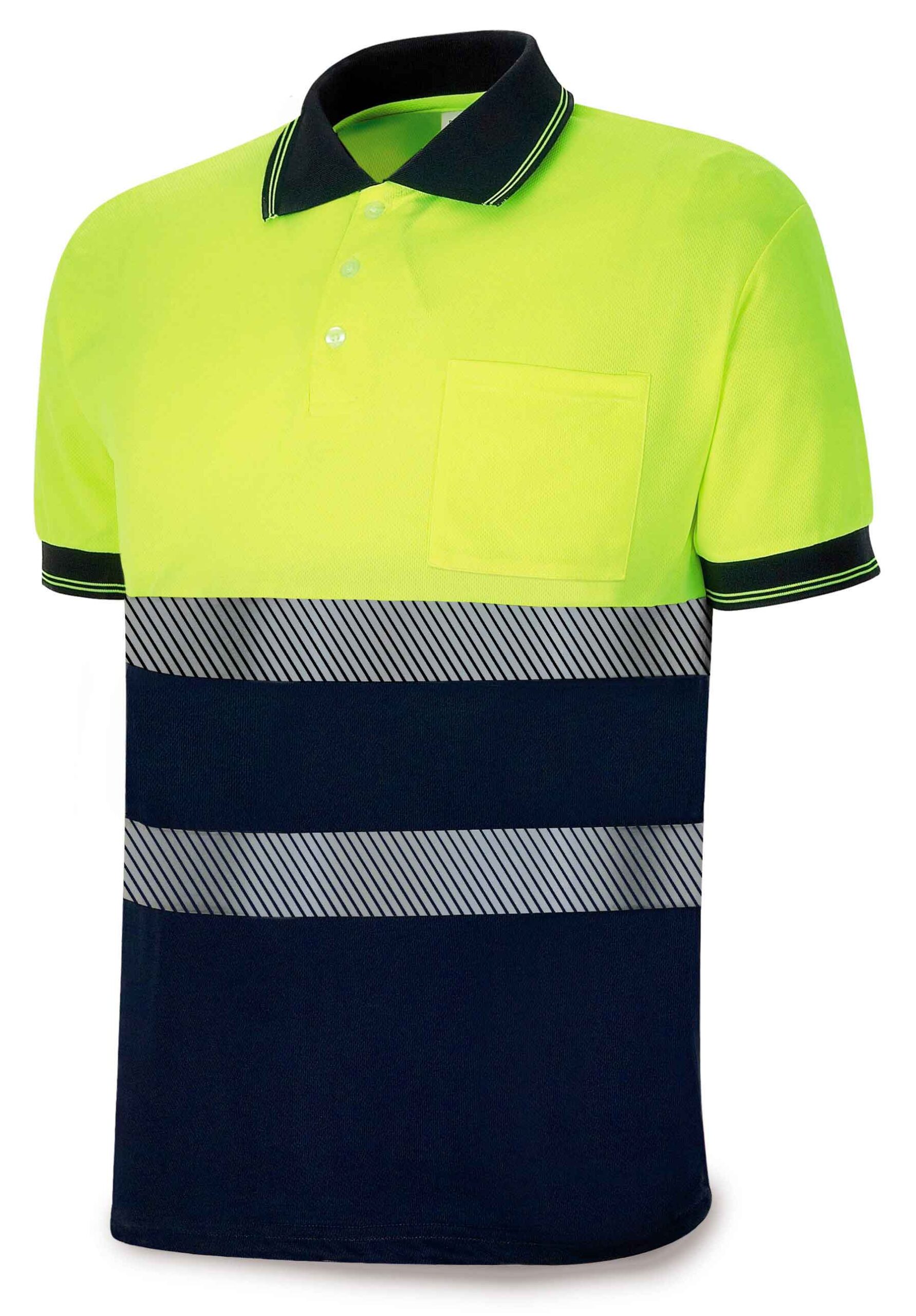 Polo alta visibilidad amarillo/azul marino de manga corta con bandas reflectantes segmentadas. Ajuste a brazo por elástico acanalado del color de contraste, con 2 franjas del color de fondo, tanto en cuello como en brazo y 1 bolsillo en pecho ubicado a la izquierda del usuario.Composición: 55% algodón / 45% poliéster.Masa laminar total: 150 gr/m2