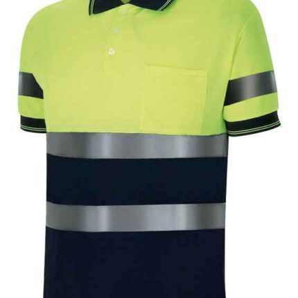 Polo alta visibilidad bicolor de manga larga. Ajuste a puño con elástico acanalado del color de contraste, con 2 franjas del color de fondo. 1 bolsillo en pecho ubicado a la izquierda del usuario. Composición y masa laminar: Lámina exterior 100% poliéster. Alta visibilidad. Máx. X25.Masa laminar total: 150 gr/m2.