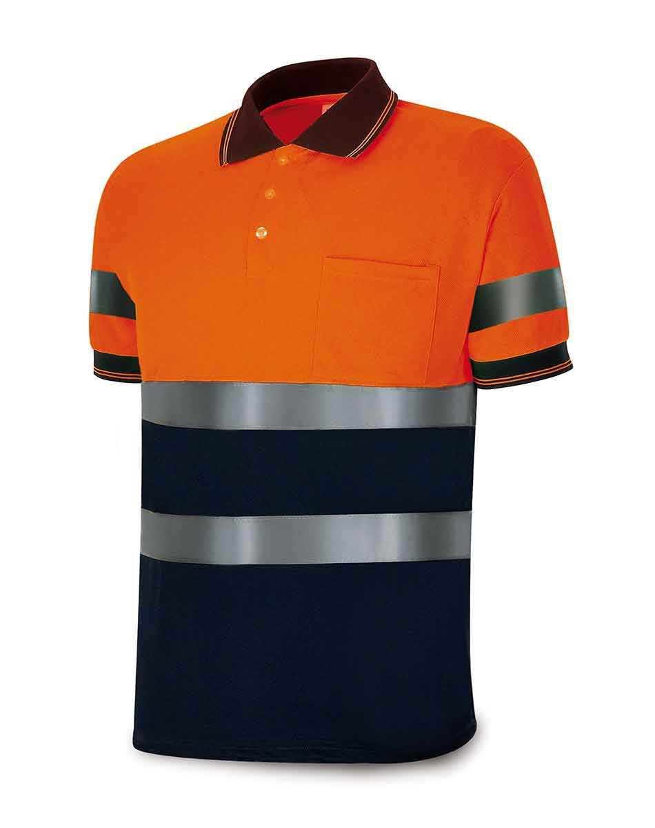 Polo alta visibilidad bicolor de manga corta. Ajuste a brazo con elástico acanalado del color de contraste, con 2 franjas del color de fondo. 1 bolsillo en pecho ubicado a la izquierda del usuario.